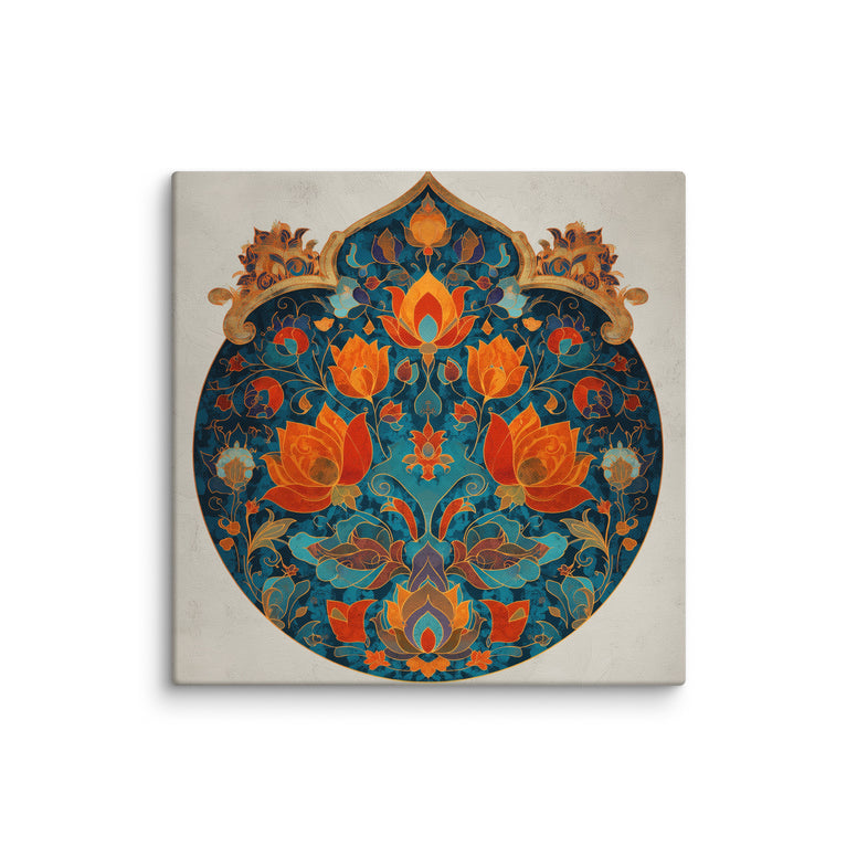 Lotus Symphony – A Mughal Floral Medallion draws inspiration from traditional Mughal floral motifs, combining opulent lotus blooms with Persian-influenced symmetry. This circular composition, set against a rich teal background, radiates warmth with vivid shades of saffron, crimson, and burnt orange. Gold accents and ornamental detailing evoke the elegance of royal manuscripts and palace ceilings, reimagined for modern interiors.