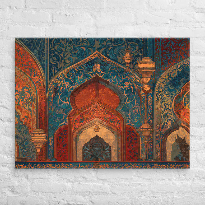 Immerse your walls in opulent color with “Crimson Arches of the Red Castle.” Inspired by the lavish interiors of South Asia’s Mughal forts, this vertical-landscape canvas bursts with swirling sapphire blues, deep scarlet reds, and gilded lamp sconces that glow against elaborate arabesque motifs. A grand, scalloped archway pulls the eye to a serene sanctuary within, while every line of filigree and floral scrollwork pays homage to centuries-old craftsmanship. Printed on museum-grade, fade-resistant canvas, this piece arrives ready to hang—instantly transforming living rooms, studies, or gallery walls into a palace of heritage and hue.