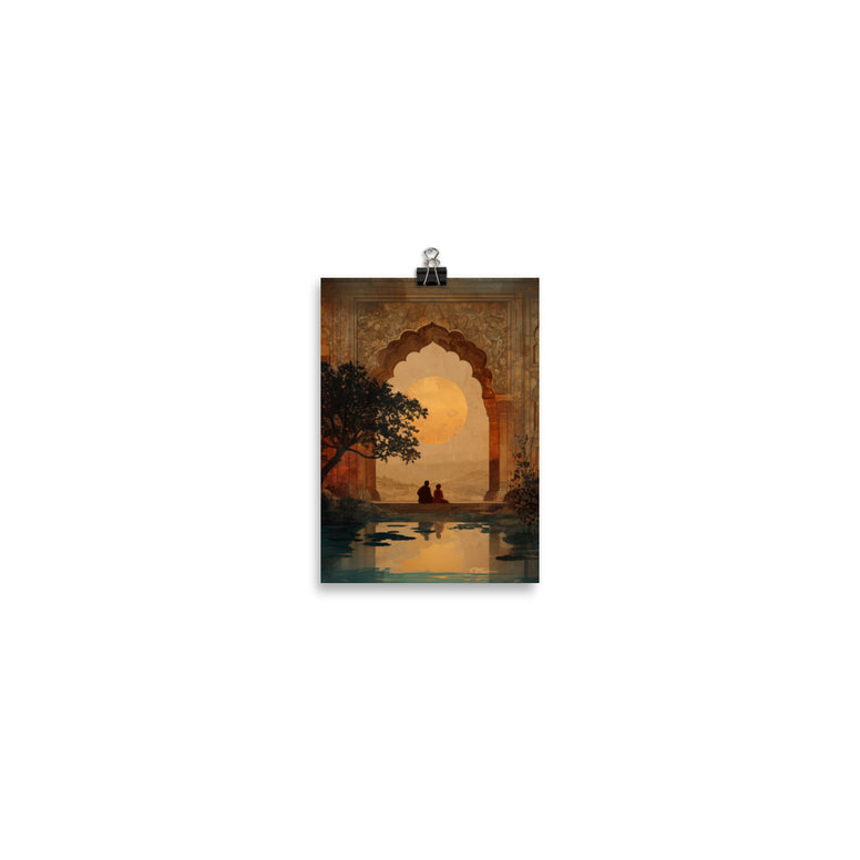 Beneath a golden sun framed by intricate Mughal arches, two figures sit side by side — their silence filled with understanding, their bond reflected in the still waters below.