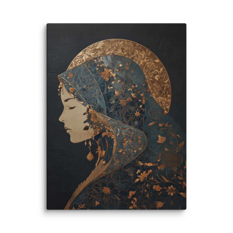 Bring timeless elegance to your space with “Golden Serenity”, a Mughal-inspired portrait blending traditional Eastern artistry with modern minimalism. This stunning artwork captures the quiet grace of a woman draped in intricate floral patterns of gold and teal, set against a deep, moody background that evokes peace and reflection.