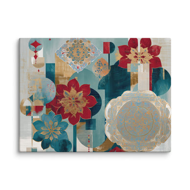 This vibrant painting reimagines classic Mughal floral patterns with a contemporary twist, perfectly suited for modern interiors. Deep teal blues and rich reds are accented with golden flourishes and geometric motifs, reflecting timeless South Asian elegance. This piece merges heritage with high-style decor. Ideal for living rooms, bedrooms, or entryways where you want to make a bold, sophisticated statement.