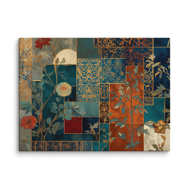 This exquisite artwork showcases intricate Mughal floral patterns intertwined with geometric grids and jali-inspired details. The composition blends rich teal, burnt orange, deep navy, and warm gold tones, creating a striking balance of tradition and contemporary minimalism. Ideal for modern American homes, this canvas print brings a touch of Mughal elegance and heritage into living rooms, bedrooms, or office spaces.