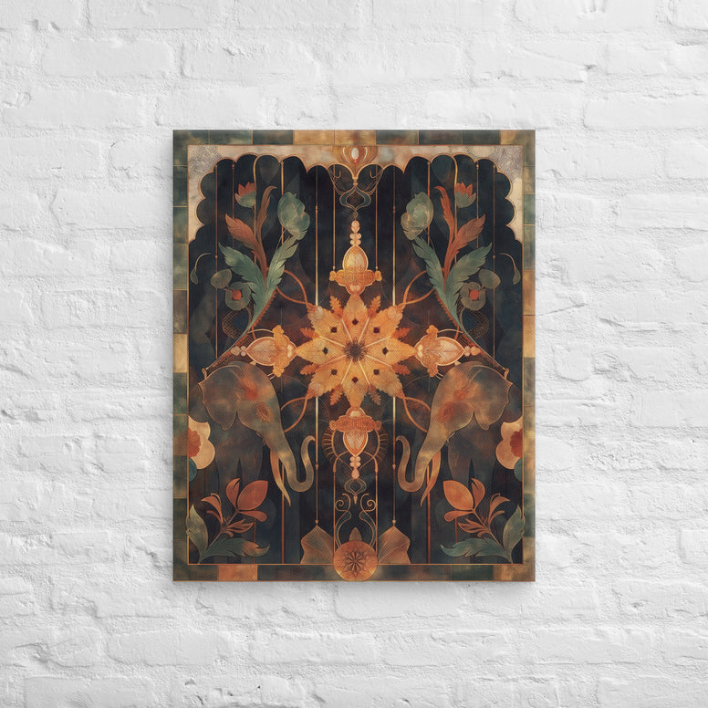 Command attention with “Obsidian Mughal Crest,” a striking portrait-format canvas that sets fiery saffron gold and deep crimson against a jet-black backdrop. A radiant eight-point star lattice anchors the design, framed by glowing mihrab arches and intricate Mughal calligraphy that seems to pulse with light. Stylized twin war elephants and a jewel-encrusted talwar sword add heraldic power, while distressed silk textures lend tactile depth and vintage character. Printed on fade-resistant, museum-grade canvas and offered in three sizes (12 × 16 in, 16 × 20 in, 24 × 30 in), this artwork delivers dramatic luxury—perfect for modern living rooms, offices, or gallery walls.