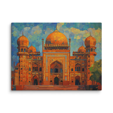 This gallery-wrapped canvas print captures the grandeur of Mughal architecture in a vibrant palette. The majestic domes, towering minarets, and intricate archways come alive in a symphony of warm amber, deep crimson, and azure tones. Printed on premium quality canvas, this piece arrives ready to hang, transforming any room into a gallery of timeless elegance.