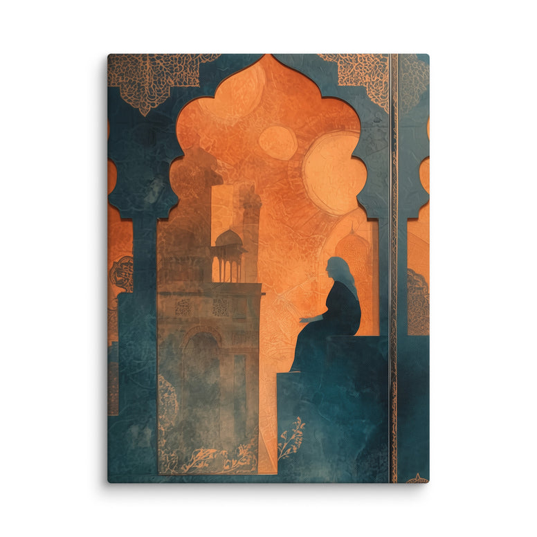 Step into the serenity of Mughal-inspired artistry with Silhouette of Reflection, a gallery-wrapped canvas that beautifully captures the stillness of contemplation. Set against a glowing palette of burnt orange and deep teal, the artwork reveals the shadowed figure of a lone thinker framed by traditional Mughal archways, overlooking a timeless monument.