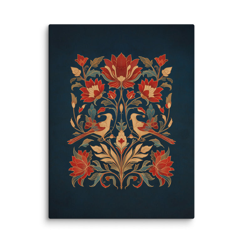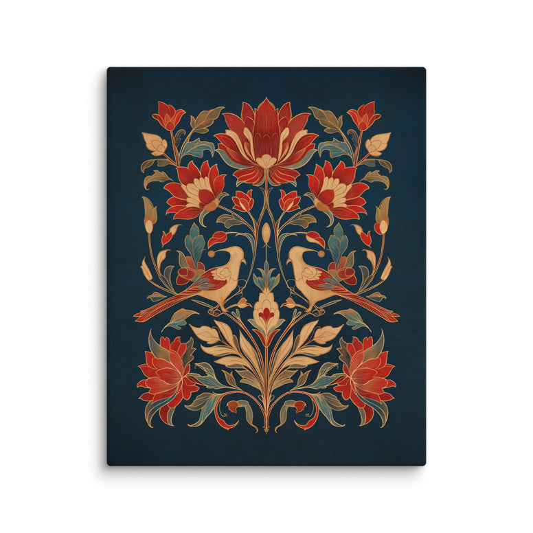 Celebrate the harmony of nature and geometry in “Symphony of Petals & Parrots.” This intricate Mughal-inspired design features two stylized golden parrots nestled amidst a cascade of radiant florals in red, gold, and teal. The deep navy background adds regal depth, making the artwork both timeless and bold.